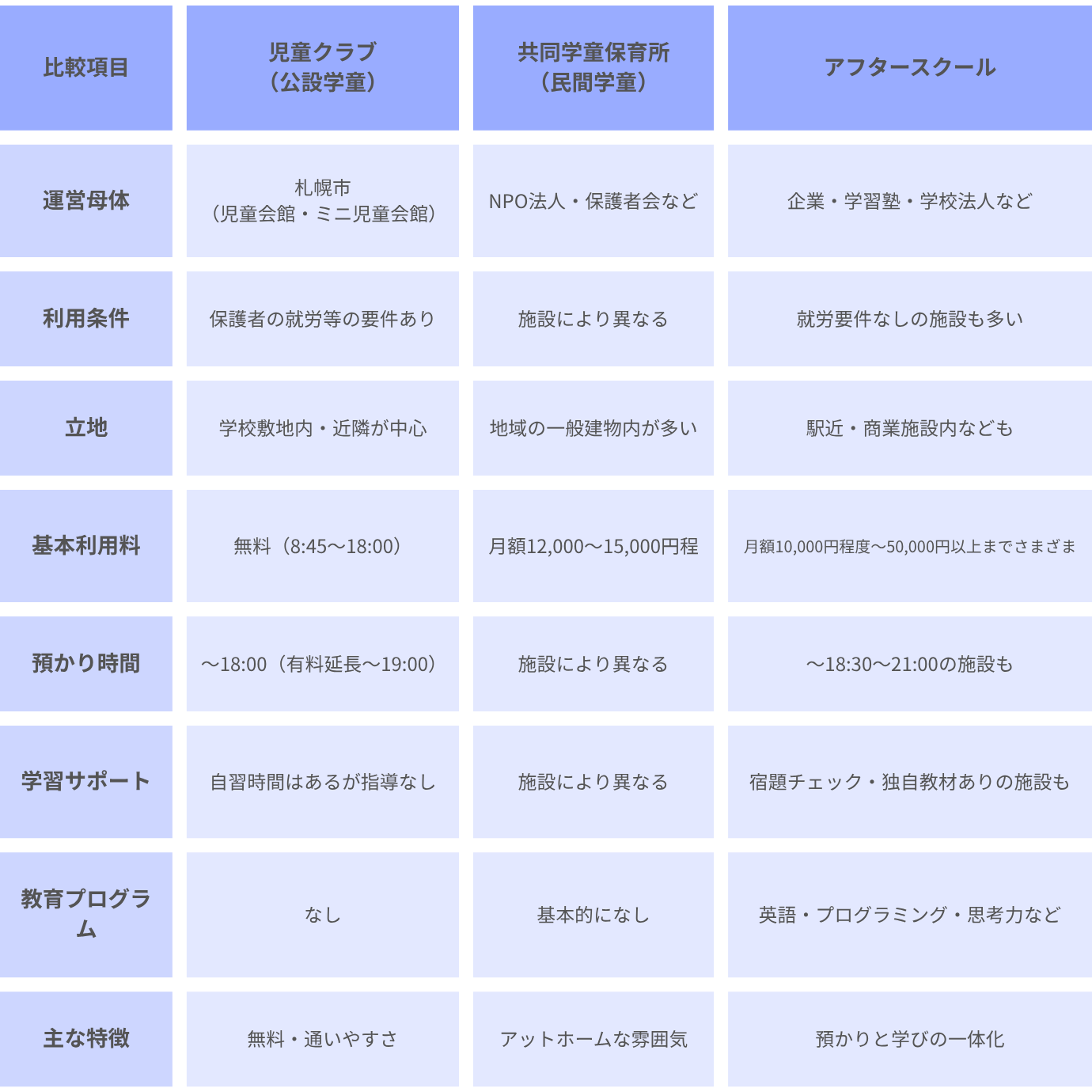 札幌市内で小学生が放課後を過ごせる場所を大きく分けると、おおむね次の3つのタイプに整理できます。