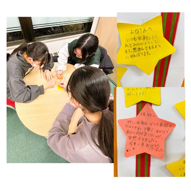 星形のメッセージカードをツリーのオーナメントに見立てながら、日頃からお世話になっている家族や親しい人への感謝のメッセージを書き入れ、塾生みんなで心のこもったクリスマスツリーを完成させていきました。