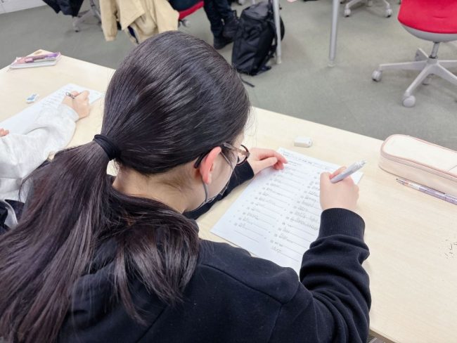 出題範囲は、各学年の教科書範囲から。事前に配布した準備プリントで皆一生懸命に練習し、全100問の英単語問題に挑戦しました。準備プリントの段階から「覚えているつもり」では通用しない内容に、生徒さんたちは一問一問真剣に向き合い、英語学習の原点を見直す大切な機会となりました。