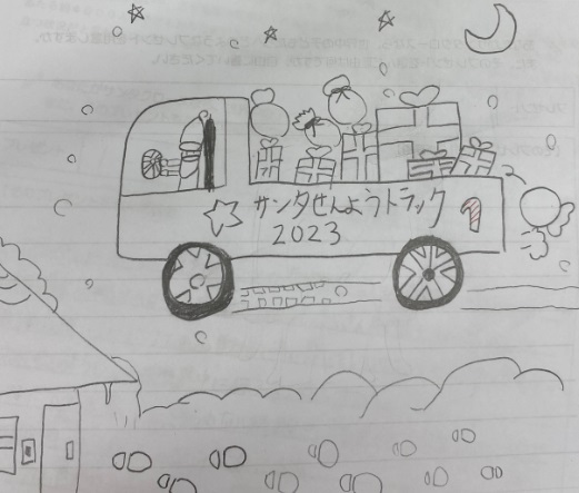 サンタさんが、トナカイではなくトラックに乗って道を走っているところに親しみを感じますね!落ちそうなくらい沢山のプレゼントや、家の前の足跡、星空など、細かい背景まで描かれていて素敵です!また『ノートとペンさえあればなににでもなれる!』という大きな可能性や希望が表現されていますね!きっとこれを書いた彼女も、将来世界中で活躍する素敵な女性になっていることと思います!