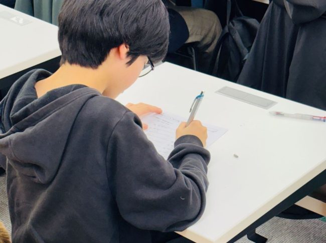 出題範囲は、各学年の教科書範囲から。事前に配布した準備プリントで皆一生懸命に練習し、全100問の英単語問題に挑戦しました。準備プリントの段階から「覚えているつもり」では通用しない内容に、生徒さんたちは一問一問真剣に向き合い、英語学習の原点を見直す大切な機会となりました。