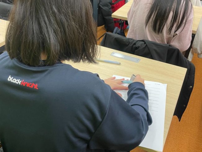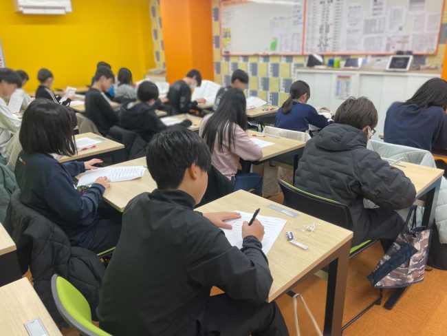 出題範囲は、各学年の教科書範囲から。事前に配布した準備プリントで皆一生懸命に練習し、全100問の英単語問題に挑戦しました。準備プリントの段階から「覚えているつもり」では通用しない内容に、生徒さんたちは一問一問真剣に向き合い、英語学習の原点を見直す大切な機会となりました。