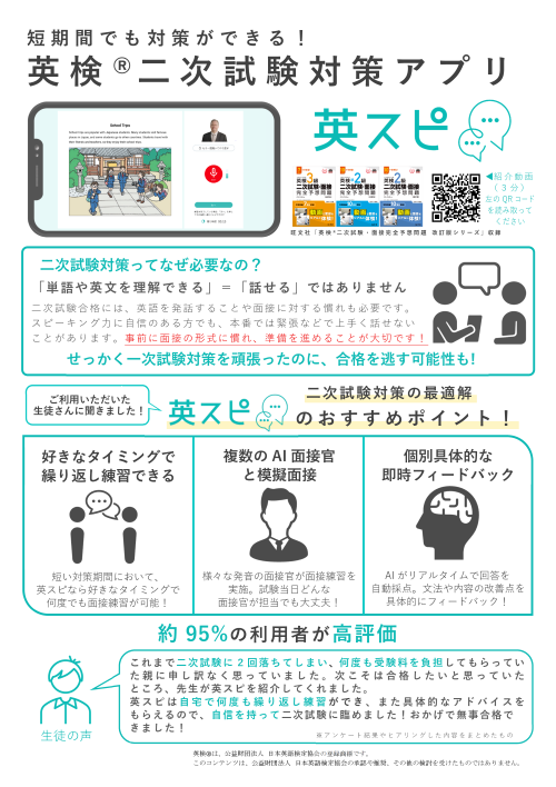 3級以上は1次試験を通過すると11/16(日)に2次試験が行われます。3.14では塾生の皆さん限定で二次試験対策アプリ「英スピ」のお申込みを承っております。申込みを希望する方は教室の先生に伝えてくださいね!すぐに今から始めよう!!